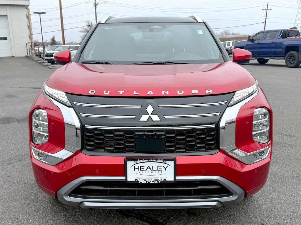 Red 2025 Mitsubishi Outlander 4WD CVT 2.5L I4 DOHC 16V LEV3-ULEV50 181hp 3rd row seats: split-bench, 4-Wheel Disc Brakes, ABS brakes, Air Conditioning, Alloy wheels, AM/FM radio: SiriusXM, Android Auto & Apple CarPlay, Auto High-beam Headlights, Automatic temperature control, Brake assist, Bumpers: body-color, Driver door bin, Driver vanity mirror, Dual front impact airbags, Dual front side impact airbags, Electronic Stability Control, Emergency communication system: Mitsubishi Connect w/ 24-month trial, Exterior Parking Camera Rear, Four wheel independent suspension, Front anti-roll bar, Front Bucket Seats, Front Center Armrest w/Storage, Front dual zone A/C, Front fog lights, Front reading lights, Fully automatic headlights, Garage door transmitter: HomeLink, Headlight cleaning, Heated door mirrors, Heated front seats, Heated rear seats, Heated steering wheel, Illuminated entry, Knee airbag, Leather Appointed Seating Surfaces, Leather Shift Knob, Leather steering wheel, Low tire pressure warning, Memory seat, Navigation System, Occupant sensing airbag, Outside temperature display, Overhead airbag, Overhead console, Panic alarm, Passenger door bin, Passenger vanity mirror, Power door mirrors, Power driver seat, Power Liftgate, Power moonroof: Panoramic, Power passenger seat, Power steering, Power windows, Radio data system, Radio: AM/FM 12.3" Navigation w/Smartphone-Link, Rain sensing wipers, Rear air conditioning, Rear anti-roll bar, Rear seat center armrest, Rear side impact airbag, Rear window defroster, Rear window wiper, Reclining 3rd row seat, Remote keyless entry, Security system, Speed control, Speed-Sensitive Wipers, Split folding rear seat, Spoiler, Steering wheel mounted audio controls, Tachometer, Telescoping steering wheel, Tilt steering wheel, Traction control, Trip computer, Turn signal indicator mirrors, Variably intermittent wipers, Wheels: 20" Two-Tone Alloy.