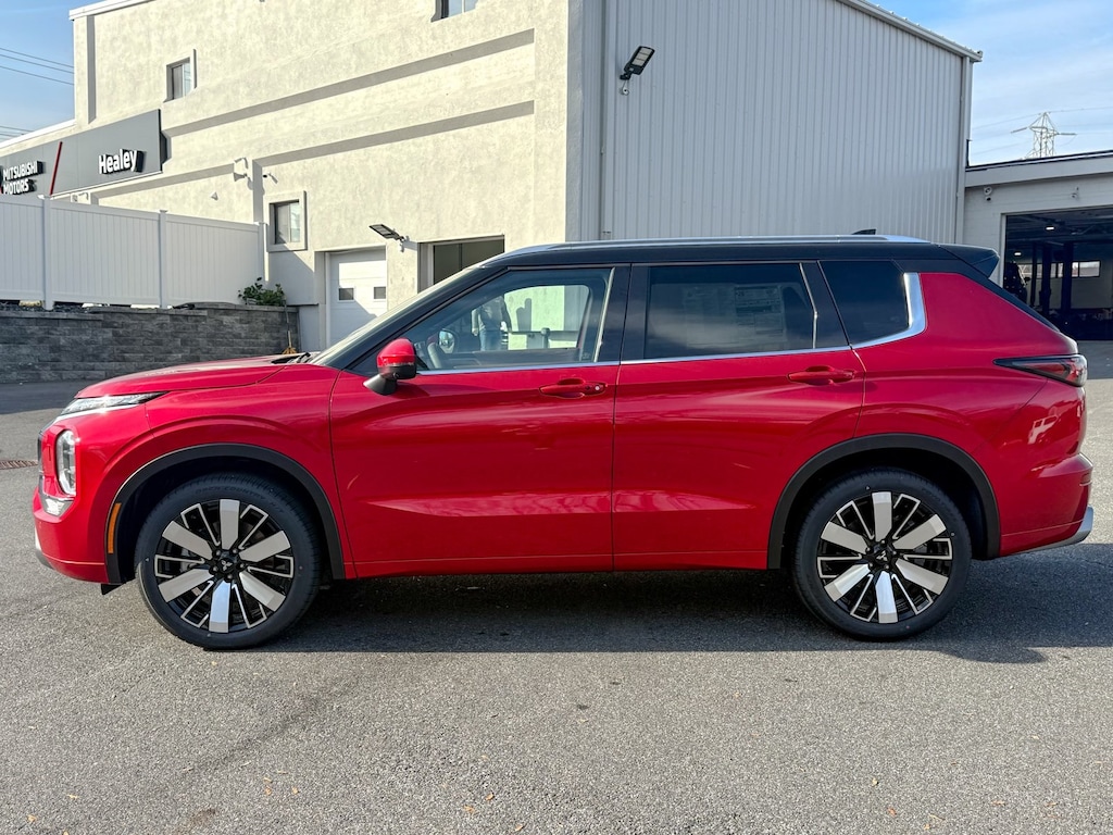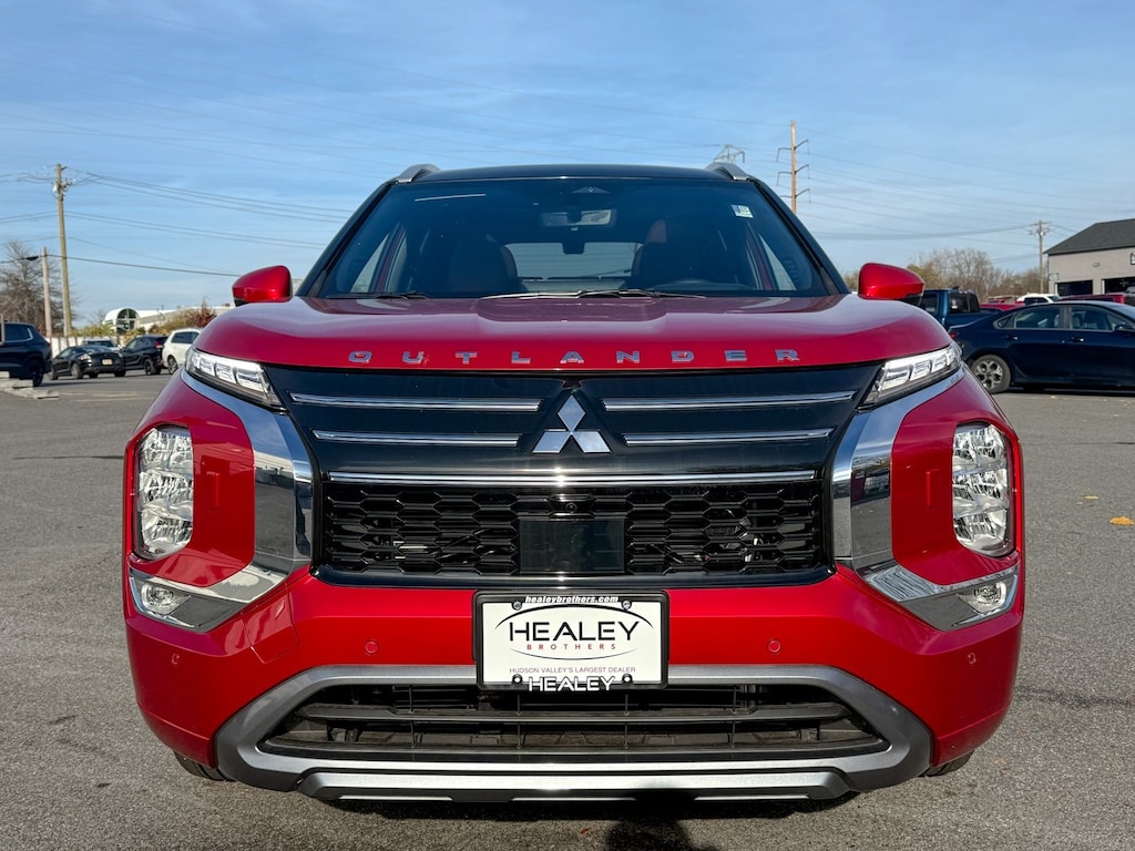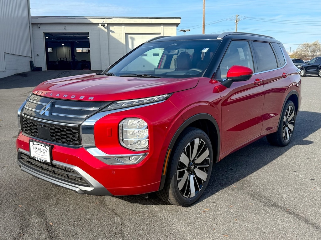 Red 2025 Mitsubishi Outlander 4WD CVT 2.5L I4 DOHC 16V LEV3-ULEV50 181hp 3rd row seats: split-bench, 4-Wheel Disc Brakes, ABS brakes, Air Conditioning, Alloy wheels, AM/FM radio: SiriusXM, Android Auto & Apple CarPlay, Auto High-beam Headlights, Automatic temperature control, Brake assist, Bumpers: body-color, Driver door bin, Driver vanity mirror, Dual front impact airbags, Dual front side impact airbags, Electronic Stability Control, Emergency communication system: Mitsubishi Connect w/ 24-month trial, Exterior Parking Camera Rear, Four wheel independent suspension, Front anti-roll bar, Front Bucket Seats, Front Center Armrest w/Storage, Front dual zone A/C, Front fog lights, Front reading lights, Fully automatic headlights, Garage door transmitter: HomeLink, Headlight cleaning, Heated door mirrors, Heated front seats, Heated rear seats, Heated steering wheel, Illuminated entry, Knee airbag, Leather Appointed Seating Surfaces, Leather Shift Knob, Leather steering wheel, Low tire pressure warning, Memory seat, Navigation System, Occupant sensing airbag, Outside temperature display, Overhead airbag, Overhead console, Panic alarm, Passenger door bin, Passenger vanity mirror, Power door mirrors, Power driver seat, Power Liftgate, Power moonroof: Panoramic, Power passenger seat, Power steering, Power windows, Radio data system, Radio: AM/FM 12.3" Navigation w/Smartphone-Link, Rain sensing wipers, Rear air conditioning, Rear anti-roll bar, Rear seat center armrest, Rear side impact airbag, Rear window defroster, Rear window wiper, Reclining 3rd row seat, Remote keyless entry, Security system, Speed control, Speed-Sensitive Wipers, Split folding rear seat, Spoiler, Steering wheel mounted audio controls, Tachometer, Telescoping steering wheel, Tilt steering wheel, Traction control, Trip computer, Turn signal indicator mirrors, Variably intermittent wipers, Wheels: 20" Two-Tone Alloy.