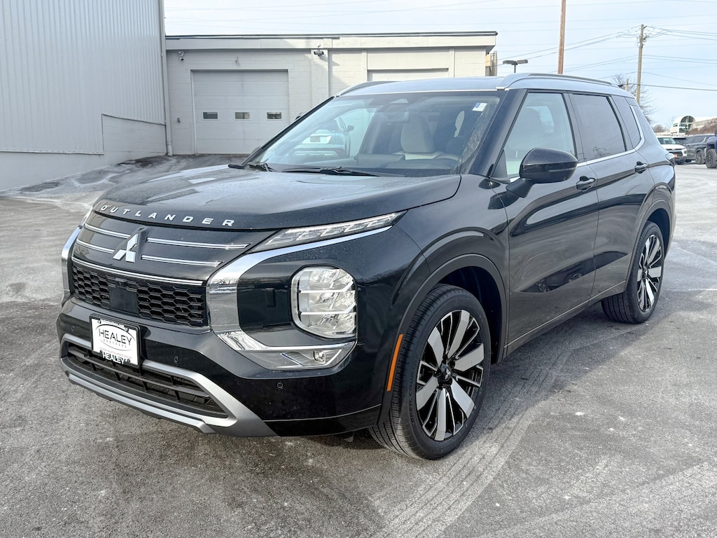 Black 2025 Mitsubishi Outlander 4WD CVT 2.5L I4 DOHC 16V LEV3-ULEV50 181hp 3rd row seats: split-bench, 4-Wheel Disc Brakes, ABS brakes, Air Conditioning, Alloy wheels, AM/FM radio: SiriusXM, Android Auto & Apple CarPlay, Auto High-beam Headlights, Automatic temperature control, Brake assist, Bumpers: body-color, Driver door bin, Driver vanity mirror, Dual front impact airbags, Dual front side impact airbags, Electronic Stability Control, Emergency communication system: Mitsubishi Connect w/ 24-month trial, Exterior Parking Camera Rear, Four wheel independent suspension, Front anti-roll bar, Front Bucket Seats, Front Center Armrest w/Storage, Front dual zone A/C, Front fog lights, Front reading lights, Fully automatic headlights, Garage door transmitter: HomeLink, Headlight cleaning, Heated door mirrors, Heated front seats, Heated rear seats, Heated steering wheel, Illuminated entry, Knee airbag, Leather Appointed Seating Surfaces, Leather Shift Knob, Leather steering wheel, Low tire pressure warning, Memory seat, Navigation System, Occupant sensing airbag, Outside temperature display, Overhead airbag, Overhead console, Panic alarm, Passenger door bin, Passenger vanity mirror, Power door mirrors, Power driver seat, Power Liftgate, Power moonroof: Panoramic, Power passenger seat, Power steering, Power windows, Radio data system, Radio: AM/FM 12.3" Navigation w/Smartphone-Link, Rain sensing wipers, Rear air conditioning, Rear anti-roll bar, Rear seat center armrest, Rear side impact airbag, Rear window defroster, Rear window wiper, Reclining 3rd row seat, Remote keyless entry, Security system, Speed control, Speed-Sensitive Wipers, Split folding rear seat, Spoiler, Steering wheel mounted audio controls, Tachometer, Telescoping steering wheel, Tilt steering wheel, Traction control, Trip computer, Turn signal indicator mirrors, Variably intermittent wipers, Wheels: 20" Two-Tone Alloy.