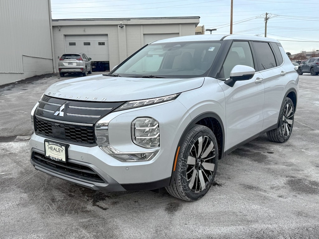 White 2025 Mitsubishi Outlander SE FWD CVT 2.5L I4 DOHC 16V LEV3-SULEV30 181hp 3rd row seats: split-bench, 4-Wheel Disc Brakes, 8 Speakers, ABS brakes, Air Conditioning, Alloy wheels, AM/FM radio: SiriusXM, Android Auto & Apple CarPlay, Auto High-beam Headlights, Auto-dimming Rear-View mirror, Automatic temperature control, Brake assist, Bumpers: body-color, Driver door bin, Driver vanity mirror, Dual front impact airbags, Dual front side impact airbags, Electronic Stability Control, Emergency communication system: Mitsubishi Connect w/ 24-month trial, Exterior Parking Camera Rear, Four wheel independent suspension, Front anti-roll bar, Front Bucket Seats, Front Center Armrest w/Storage, Front dual zone A/C, Front fog lights, Front reading lights, Fully automatic headlights, Garage door transmitter: HomeLink, Heated door mirrors, Heated Front Bucket Seats, Heated front seats, Illuminated entry, Knee airbag, Leather Shift Knob, Leather steering wheel, Low tire pressure warning, Navigation System, Occupant sensing airbag, Outside temperature display, Overhead airbag, Overhead console, Panic alarm, Passenger door bin, Passenger vanity mirror, Power door mirrors, Power driver seat, Power Liftgate, Power steering, Power windows, Radio data system, Radio: AM/FM 12.3" Navigation w/Smartphone-Link, Rain sensing wipers, Rear anti-roll bar, Rear seat center armrest, Rear side impact airbag, Rear window defroster, Rear window wiper, Reclining 3rd row seat, Remote keyless entry, Security system, Speed control, Speed-Sensitive Wipers, Split folding rear seat, Spoiler, Steering wheel mounted audio controls, Synthetic Leather Seating Surfaces, Tachometer, Telescoping steering wheel, Tilt steering wheel, Traction control, Trip computer, Turn signal indicator mirrors, Variably intermittent wipers, Wheels: 20" Two-Tone Alloy.
