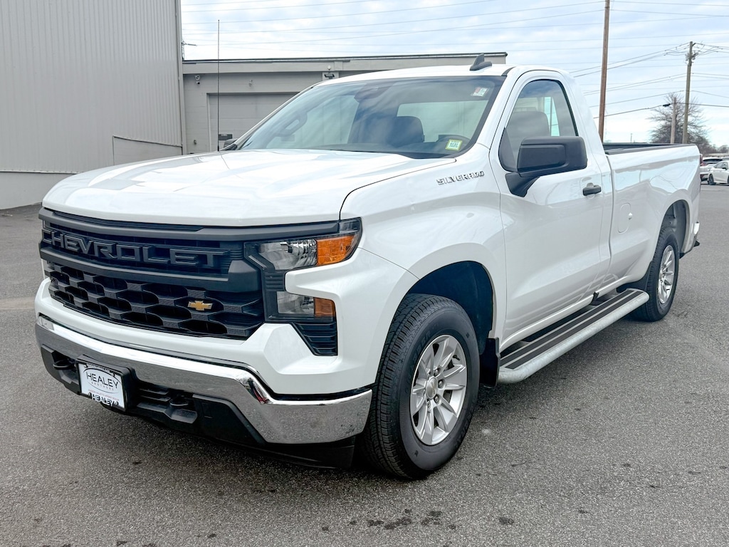 Summit White 2024 Chevrolet Silverado 1500 WT RWD 10-Speed Automatic EcoTec3 5.3L V8 170 Amp Alternator, 2 Speakers, 2-Speaker Audio System, 220 Amp Alternator, 3.5" Monochromatic Display Driver Info Center, 4-Wheel Disc Brakes, 40/20/40 Front Split Bench Seat, ABS brakes, Air Conditioning, Auto High-beam Headlights, Automatic Emergency Braking, Auxiliary External Transmission Oil Cooler, Black (Semi-Gloss) Front Bumper, Black (Semi-Gloss) Rear Bumper, Bluetooth® For Phone, Brake assist, Chevrolet Connected Access Capable, Compass, Delay-off headlights, Driver door bin, Dual front impact airbags, Dual front side impact airbags, Electrical Steering Column Lock, Electronic Cruise Control, Electronic Stability Control, External Engine Oil Cooler, EZ Lift Power Lock & Release Tailgate, Following Distance Indicator, Forward Collision Alert, Front anti-roll bar, Front Center Armrest w/Storage, Front Chrome Bumper, Front Frame-Mounted Black Recovery Hooks, Front License Plate Kit, Front Pedestrian Braking, Front reading lights, Front wheel independent suspension, Fully automatic headlights, HD Rear Vision Camera, Heated door mirrors, Heated Power-Adjustable Outside Mirrors, Illuminated entry, Inside Rear-View Mirror w/Tilt, IntelliBeam Automatic High Beam On/Off, Lane Keep Assist w/Lane Departure Warning, Locking Tailgate, Low tire pressure warning, Manual Tailgate Function w/No EZ Lift, Manual Tilt Wheel Steering Column, Occupant sensing airbag, OnStar & Chevrolet Connected Services Capable, Outside temperature display, Overhead airbag, Overhead console, Panic alarm, Passenger door bin, Passenger vanity mirror, Power door mirrors, Power Front Windows w/Driver Express Up/Down, Power Front Windows w/Passenger Express Down, Power steering, Power windows, Preferred Equipment Group 1WT, Premium audio system: Chevrolet Infotainment 3, Radio data system, Radio: Chevrolet Infotainment 3 System, Rear Chrome Bumper, Rear reading lights, Rear step bumper, Remote Keyless Entry, Remote keyless entry, Rubberized-Vinyl Floor Covering, SiriusXM Delete, Solar Absorbing Tinted Glass, Speed-sensing steering, Standard Suspension Package, Standard Tailgate, Tachometer, Tilt steering wheel, Traction control, Trip computer, Variably intermittent wipers, Vinyl Seat Trim, Voltmeter, Wheels: 17" x 8" Bright Silver Painted Aluminum, Wheels: 17" x 8" Ultra Silver Painted Steel, Wi-Fi Hot Spot Capable.