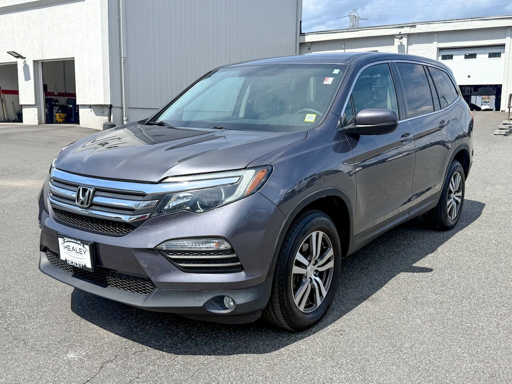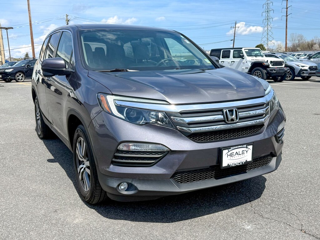 Modern Steel Metallic 2018 Honda Pilot EX AWD 6-Speed Automatic 3.5L V6 24V SOHC i-VTEC 18" Alloy Wheels, 3rd row seats: split-bench, 4-Wheel Disc Brakes, 4.25 Axle Ratio, 7 Speakers, ABS brakes, Air Conditioning, Alloy wheels, AM/FM radio: SiriusXM, Apple CarPlay/Android Auto, Automatic temperature control, Brake assist, Bumpers: body-color, Cloth Seat Trim, Compass, Delay-off headlights, Driver door bin, Driver vanity mirror, Dual front impact airbags, Dual front side impact airbags, Electronic Stability Control, Exterior Parking Camera Rear, Four wheel independent suspension, Front anti-roll bar, Front Bucket Seats, Front Center Armrest, Front dual zone A/C, Front fog lights, Front reading lights, Fully automatic headlights, Garage door transmitter: HomeLink, Heated door mirrors, Illuminated entry, Low tire pressure warning, Occupant sensing airbag, Outside temperature display, Overhead airbag, Overhead console, Panic alarm, Passenger door bin, Passenger vanity mirror, Power door mirrors, Power driver seat, Power steering, Power windows, Radio data system, Radio: AM/FM Audio System, Rear air conditioning, Rear anti-roll bar, Rear reading lights, Rear seat center armrest, Rear window defroster, Rear window wiper, Remote keyless entry, Security system, SiriusXM Radio, Speed control, Speed-sensing steering, Speed-Sensitive Wipers, Split folding rear seat, Spoiler, Steering wheel mounted audio controls, Tachometer, Telescoping steering wheel, Tilt steering wheel, Traction control, Trip computer, Variably intermittent wipers.
