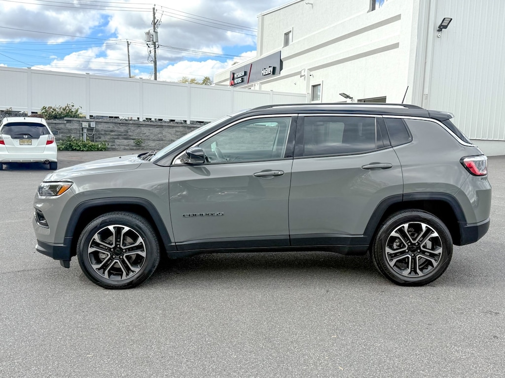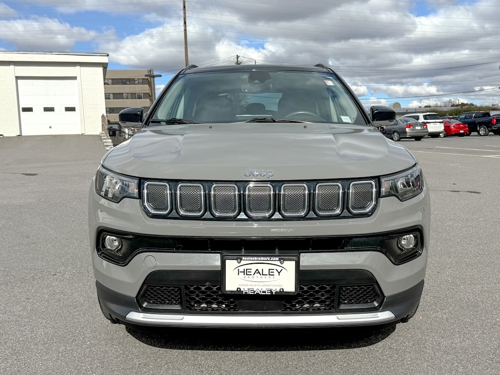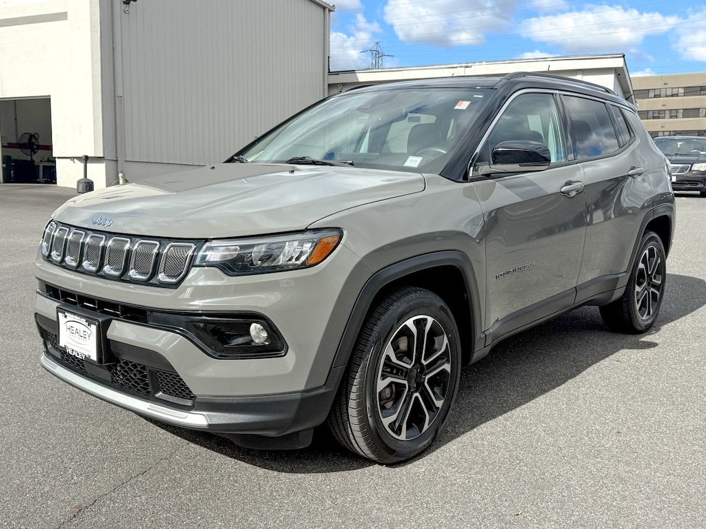 Sting-Gray Clearcoat 2022 Jeep Compass Limited 4WD 9-Speed 948TE Automatic 2.4L I4 10.1" Touchscreen Display, 3.73 Axle Ratio, 4-Wheel Disc Brakes, 6 Speakers, ABS brakes, Air Conditioning, Alloy wheels, AM/FM radio: SiriusXM, Anti-whiplash front head restraints, Auto High-beam Headlights, Auto-dimming Rear-View mirror, Automatic temperature control, Brake assist, Bumpers: body-color, Compass, Delay-off headlights, Disassociated Touchscreen Display, Driver door bin, Driver vanity mirror, Dual front impact airbags, Dual front side impact airbags, Electronic Stability Control, Emergency communication system: SiriusXM Guardian, Four wheel independent suspension, Front anti-roll bar, Front Bucket Seats, Front Center Armrest w/Storage, Front dual zone A/C, Front fog lights, Front License Plate Bracket, Front reading lights, Fully automatic headlights, Global Telematics Box Module (TBM), Gloss Black Exterior Mirrors, Heated door mirrors, Heated front seats, Heated steering wheel, Illuminated entry, Knee airbag, Leather Shift Knob, Leather Trimmed Bucket Seats, Low tire pressure warning, Occupant sensing airbag, Outside temperature display, Overhead airbag, Overhead console, Panic alarm, ParkView Rear Back-Up Camera, Passenger door bin, Passenger vanity mirror, Power door mirrors, Power driver seat, Power Front/Fixed Rear Full Sunroof, Power steering, Power windows, Premium Alpine Speaker System, Quick Order Package 2GG, Radio: Uconnect 5 w/10.1" Display, Rain sensing wipers, Rear anti-roll bar, Rear seat center armrest, Rear window defroster, Rear window wiper, Remote keyless entry, Roof rack: rails only, Security system, Speed control, Split folding rear seat, Spoiler, Steering wheel mounted audio controls, Sun and Sound Group, Tachometer, Telescoping steering wheel, Tilt steering wheel, Traction control, Trip computer, Turn signal indicator mirrors, Variably intermittent wipers, Wheels: 18" x 7" Painted Diamond Cut Aluminum.
