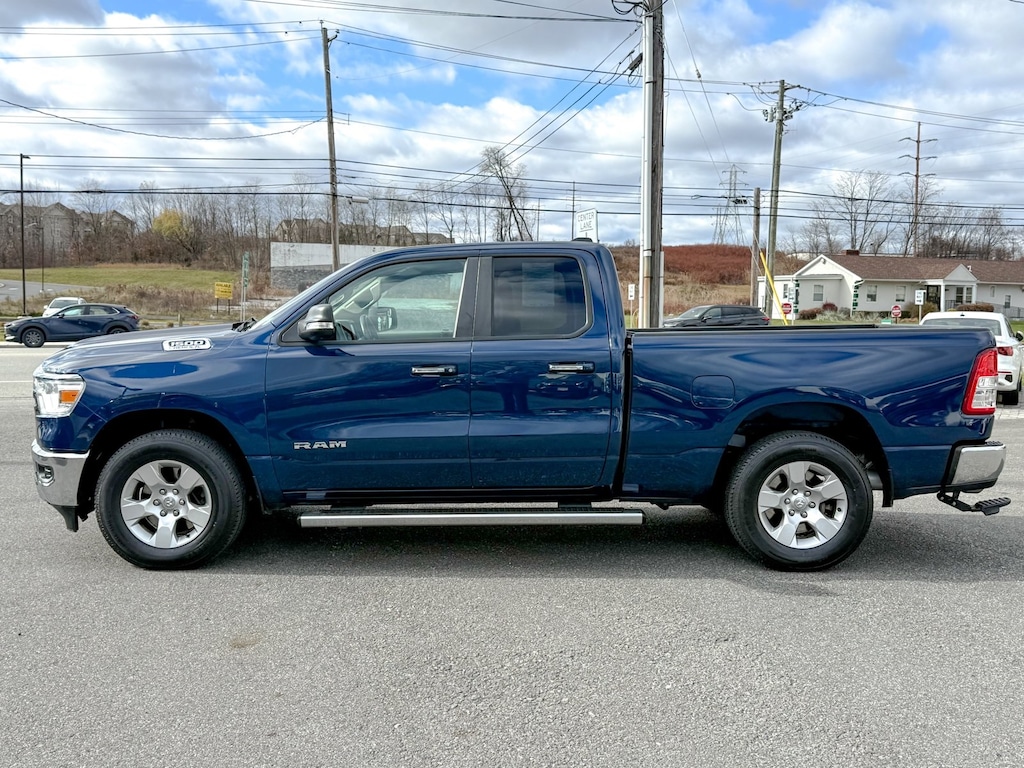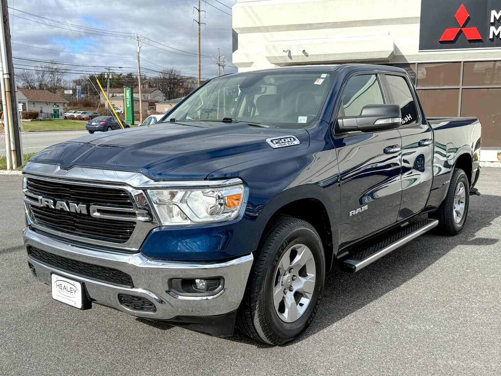 Patriot Blue Pearlcoat 2020 Ram 1500 Big Horn/Lone Star 4WD 8-Speed Automatic HEMI 5.7L V8 Multi Displacement VVT 3 Rear Seat Head Restraints, 3.21 Rear Axle Ratio, 4 Adjustable Cargo Tie-Down Hooks, 4 Way Front Headrests, 4-Wheel Disc Brakes, 48V Belt Starter Generator, 6 Speakers, ABS brakes, Air Conditioning, Alloy wheels, AM/FM radio, Auto-Dimming Rear-View Mirror, Bed Utility Group, Big Horn IP Badge, Big Horn Level 1 Equipment Group, Black Premium Power Mirrors, Brake assist, Bumpers: chrome, Class IV Receiver Hitch, Cloth Bench Seat, Cluster 3.5" TFT Color Display, Compass, Delay-off headlights, Deployable Bed Step, Driver door bin, Dual front impact airbags, Dual front side impact airbags, Electronic Stability Control, Foam Bottle Insert (Door Trim Panel), Front anti-roll bar, Front Center Armrest w/Storage, Front fog lights, Front reading lights, Front Seat Back Map Pockets, Front wheel independent suspension, Fully automatic headlights, Glove Box Lamp, GPS Antenna Input, Heated door mirrors, Illuminated entry, Leather steering wheel, Low tire pressure warning, Manual Adjust 4-Way Front Passenger Seat, Occupant sensing airbag, Outside temperature display, Overhead airbag, Overhead console, Panic alarm, ParkView Rear Back-Up Camera, Passenger door bin, Passenger vanity mirror, Pick-Up Box Lighting, Power 4-Way Driver Lumbar Adjust, Power 8-Way Driver Seat, Power Adjustable Pedals, Power door mirrors, Power steering, Power windows, Quick Order Package 25Z Big Horn, Radio data system, Radio: Uconnect 3 w/5" Display, Radio: Uconnect 4 w/8.4" Display, Rear 60/40 Folding Seat, Rear anti-roll bar, Rear Dome w/On/Off Switch Lamp, Rear Power Sliding Window, Rear seat center armrest, Rear step bumper, Rear Window Defroster, Remote keyless entry, Remote Start System, SiriusXM Satellite Radio, Speed control, Split folding rear seat, Spray In Bedliner, Steering wheel mounted audio controls, Sun Visors w/Illuminated Vanity Mirrors, Tachometer, Telescoping steering wheel, Tilt steering wheel, Traction control, Trip computer, Universal Garage Door Opener, Variably intermittent wipers, Voltmeter, Wheels: 18" x 8" Cast-Aluminum Painted.